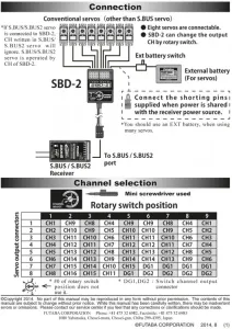 The SBD-2 is a converter for using conventional servos (other than S.BUS servo) with the S.BUS/S.BUS2 system. The SBD-2 connects to the receiver output of a S.BUS/S.BUS2 system and eight servos can be used. SBD-2 can change the output CH from 9 groups select by rotary switch. SBD-2 can use EXT battery (for servos).