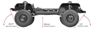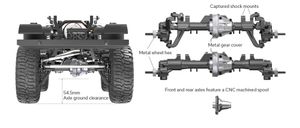 Gen9 leveres godt rustet med sine redesignet portalaksler, dekk med høyt grep, 25kg styreservo, justerbar akselavstand og et karosseri med masse flotte detaler. Gen9 er designet for å kunne ha 14 LED-lyspærer som gir deg rocklights i hjulbrønnene i tillegg til resten av bilen (medfølger ikke). Gen9 har også 80mm bakkeklaring fra chassis, 63,5 graders tilnærmingsvinkel og 53 grader avgangsvinkel noe som gjør den fantastisk i terrenget.