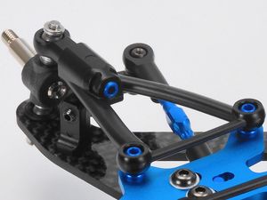 • 2.5mm thick carbon fiber front lower suspension arms have two attachment positions (3mm adjustment for each side) to adjust its width and attach wheels with different offsets.