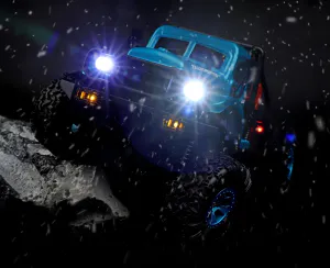 The WL 184020 is a 1/18 scale 4WD RC crawler equipped with a 130 carbon brushed motor and 9g 3-wire metal gear servo. The model features a two-speed gearbox with gear shifting function, integrated LED lighting, and simulation shock absorbers for controlled low-speed driving. Rubber tires mounted on alloy wheels provide stable traction. Supplied RTR with 7.4V 350mAh Li-ion battery and USB charger with overcharge protection.
