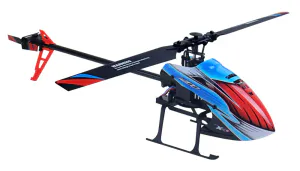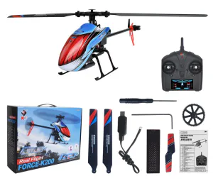 The WL K200 is a 4-channel RC helicopter designed for stable and controlled flight. It features a 6-axis gyroscope combined with air pressure altitude hold and optical flow positioning to support steady hovering performance. The model operates without ailerons, using a simplified control layout suitable for entry-level and intermediate users. One-key takeoff and landing functions are integrated for simplified operation. The helicopter includes hover debug mode for fine adjustment during flight. Optical flow positioning performs best in strong light conditions with clear ground patterns and low wind, at approximately 1.5 meters altitude. The flight control system includes dual receiver converter sockets: 5V compatible with S-BUS receivers (e.g., FUTABA) and 3V compatible with DSM receivers. The main motor uses a 050 brushed motor with heat sink, and the tail motor features a 1020 hollow cup motor with detachable plug design for easier replacement.
